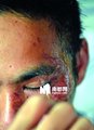 被打民众马建军展示伤情,眼睛、鼻子、嘴巴仍然红肿,鼻梁上有一道伤口。胡友军 摄