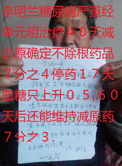 6、服用李元明中药制剂40天停药后,1--16天没有任何血糖反弹,17天时血糖上升0.5。2个月后血糖上升到加了原来一次药正常。说明疗效是:治疗40天后治愈7分之4疾病。60天保持治愈7分之3疾病。后来因经济困难停药说:能凑合了,老了,就这样吧。。。。。。。以后没有服用李元明中药制剂。