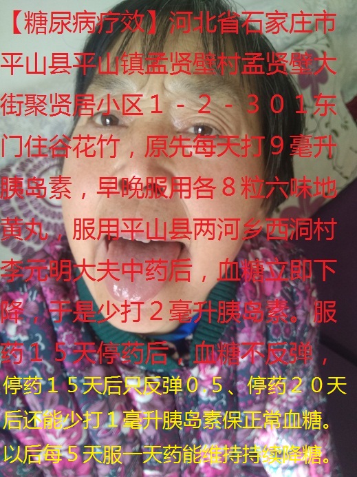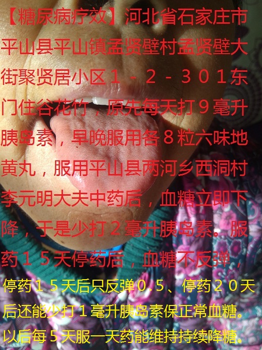 5、自称:李元明大夫糖尿病中药制剂立即能降糖,并能在停药后稳定维持很长时间不反弹。原先每天服用六味地黄丸16粒、打胰岛素9毫升。同时服用李元明中药制剂15天停药,血糖持续下降,患者就减少打胰岛素,目的是把不能除根治疗的胰岛素替换下来,然后逐渐减少李元明大夫中药制剂,直到不用任何药品,除根治愈糖尿病。服用李元明中药制剂15天后,减少打胰岛素2毫升,即只打7毫升即可维持正常血糖。因刚刚开始服用了200元一天高档药,所以在长期停药血糖上升到19的时候(恢复原来每天9毫升胰岛素和口服六味地黄丸16粒情况下),开始继续服用李元明中药制剂,并且每5天只服用一天一付,控制血糖就能正常,10天后,把胰岛素9毫升减为了8毫升能维持正常。现在是2018--01--13日,正在继续服药治疗中。。。。。。。